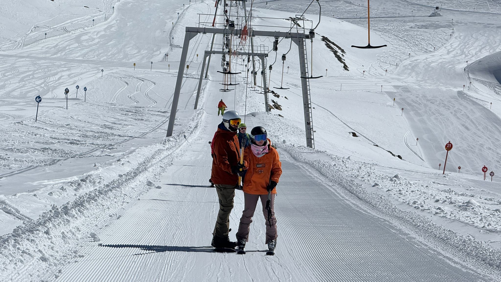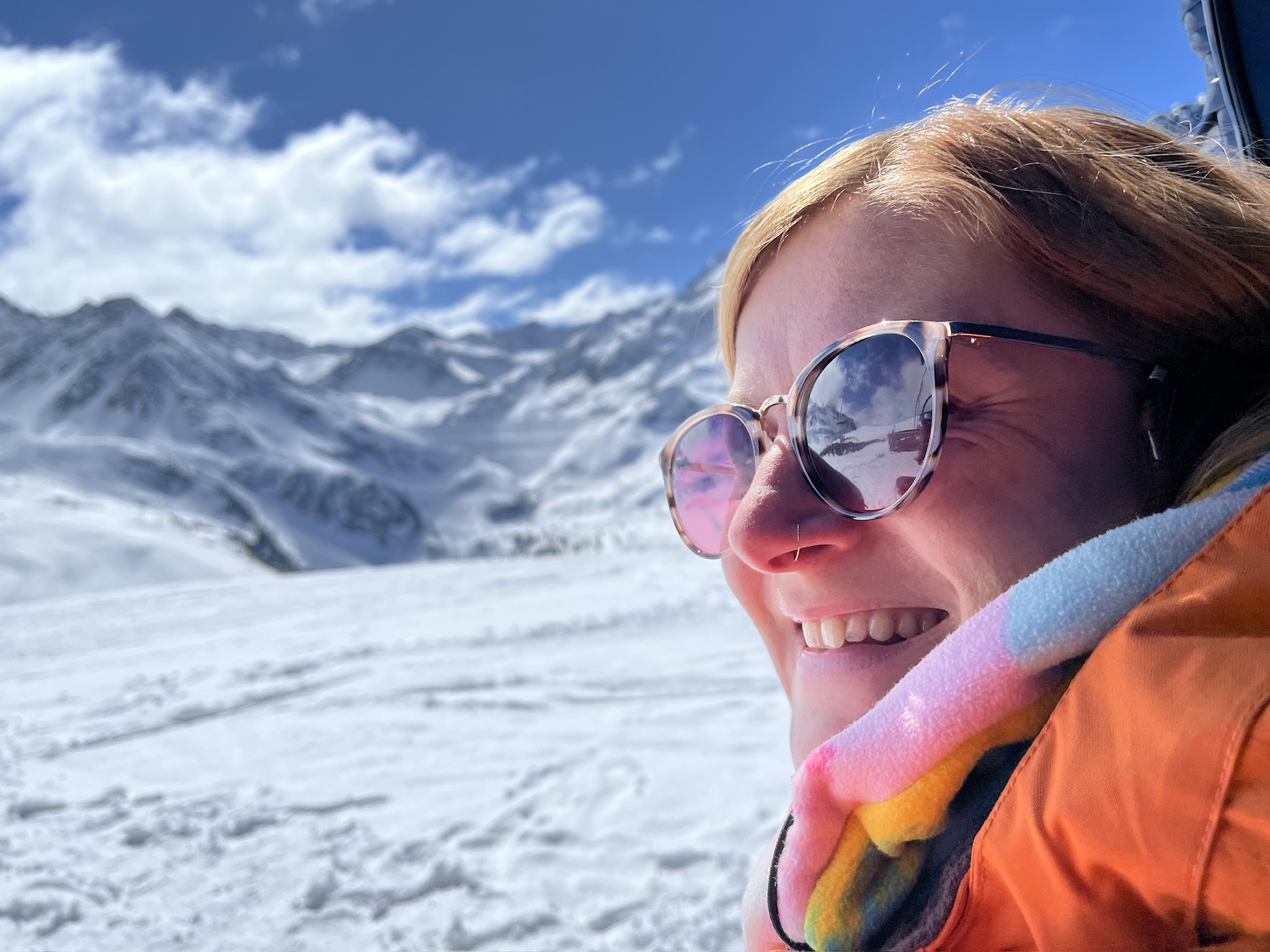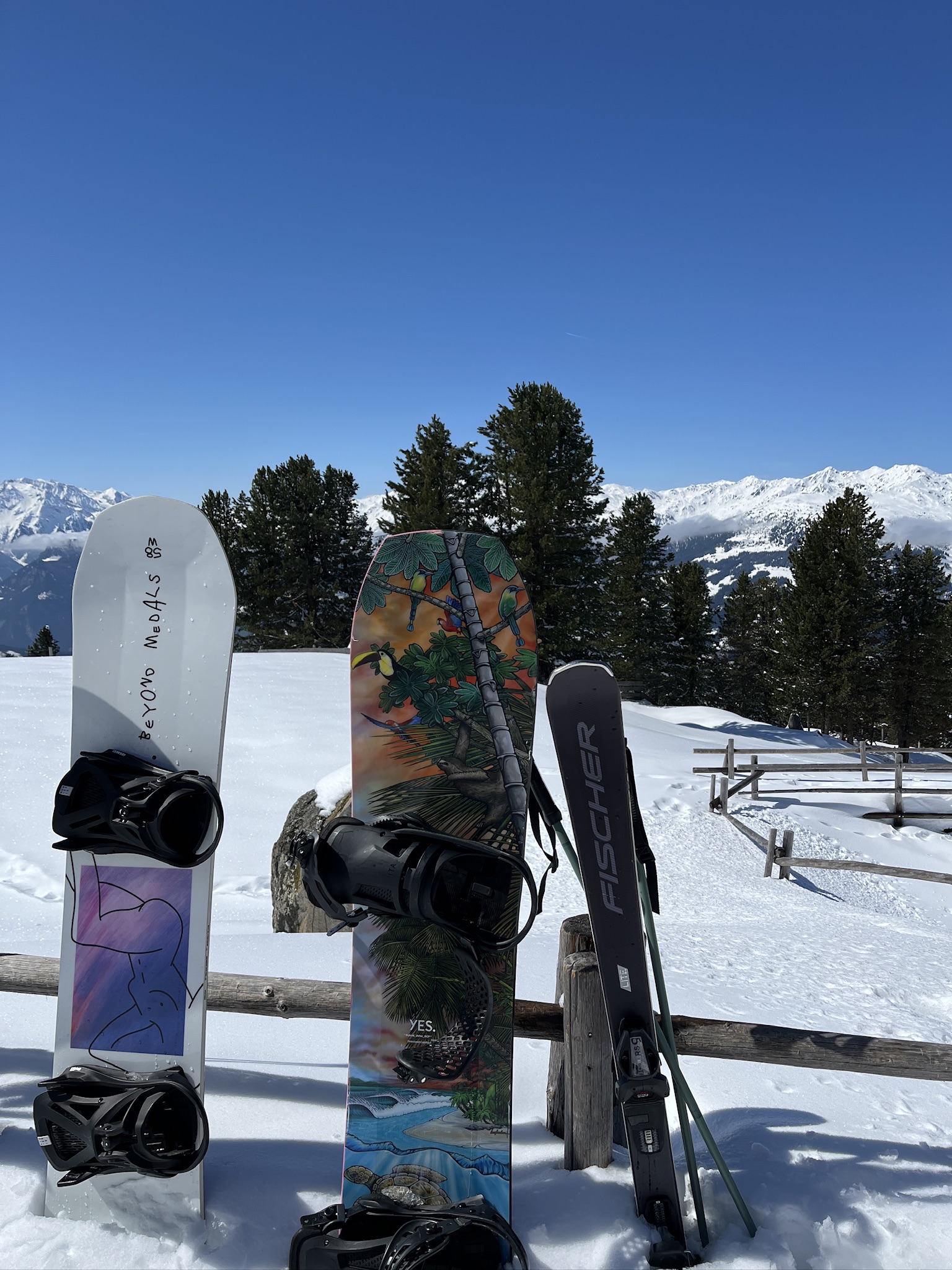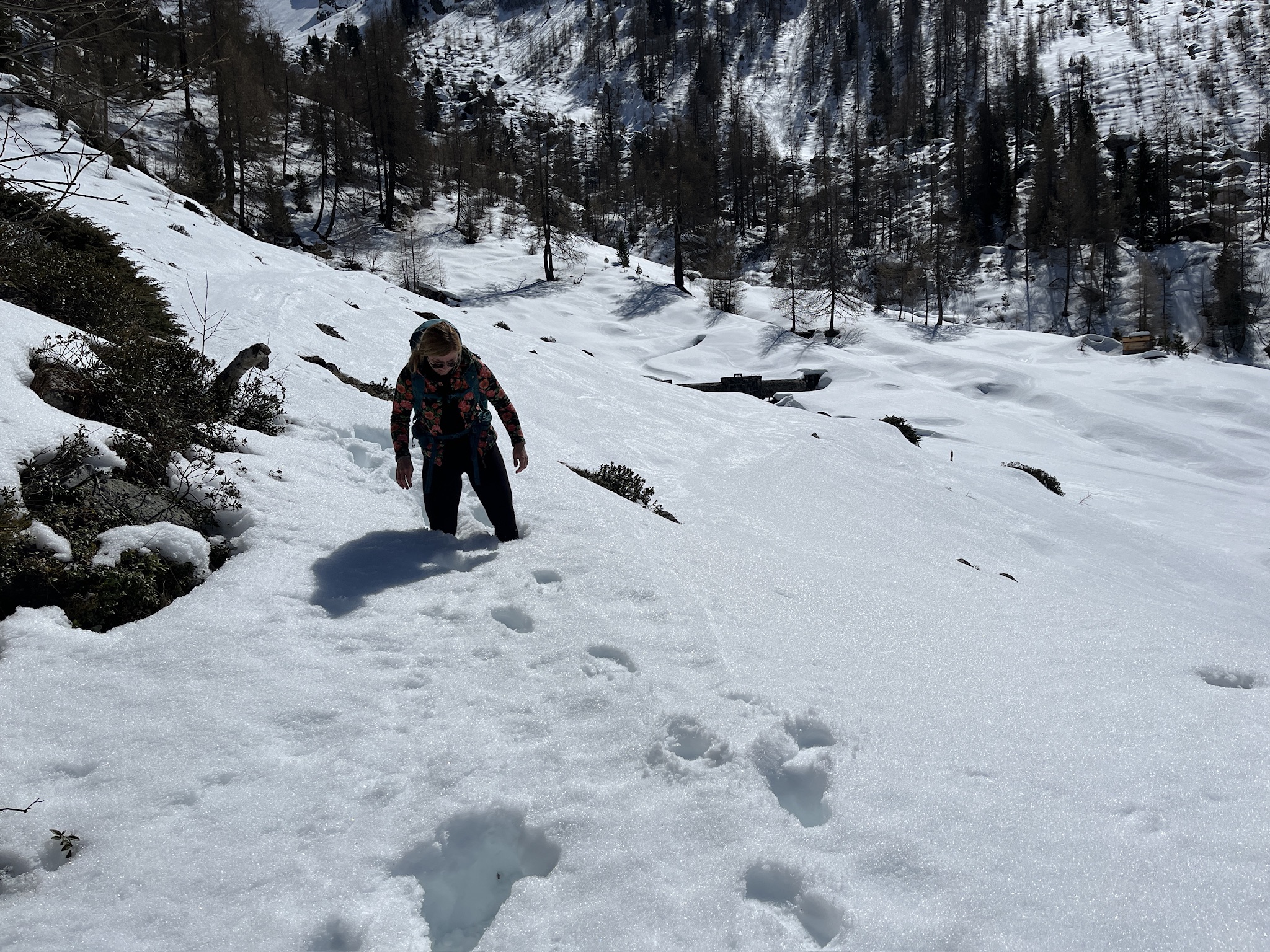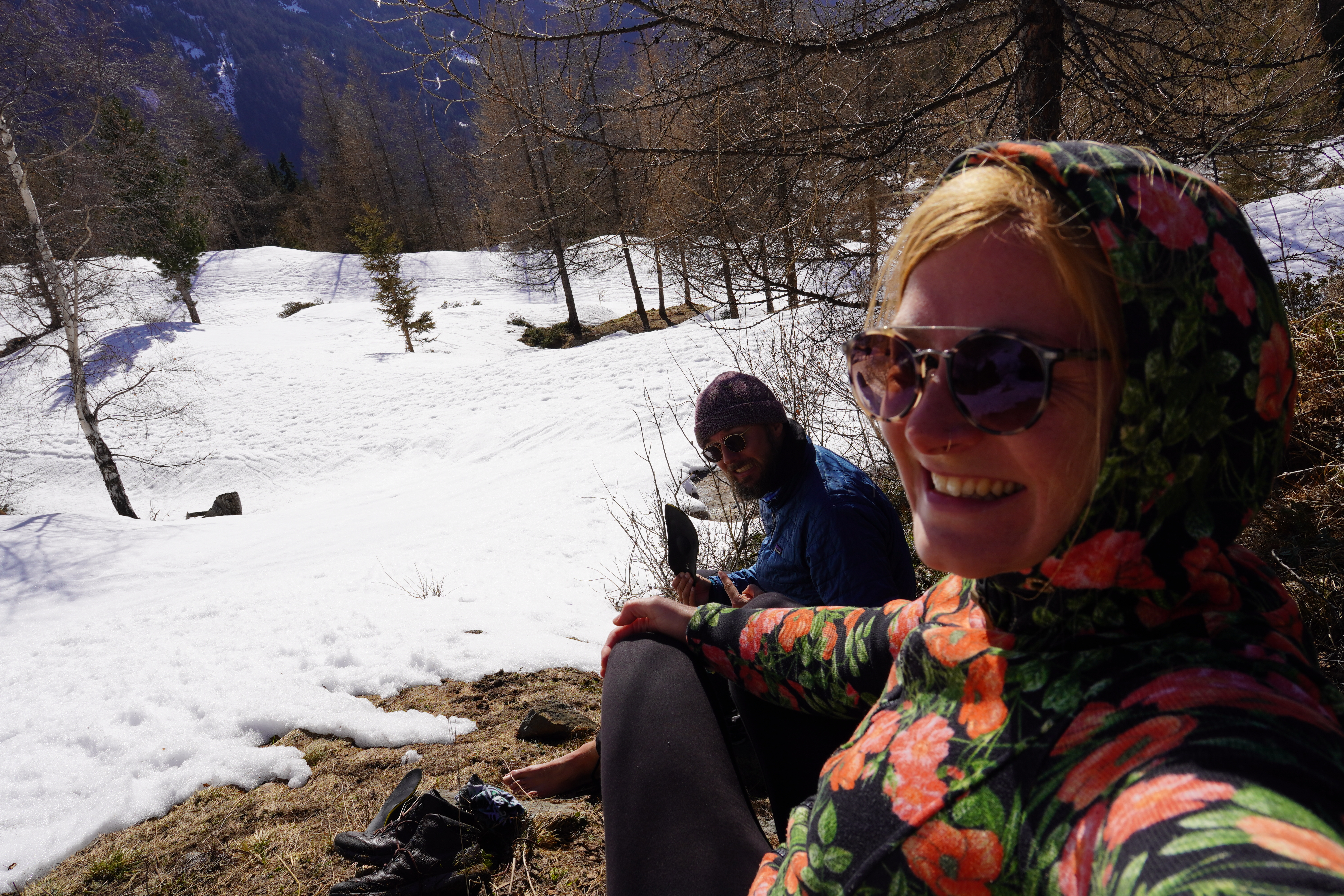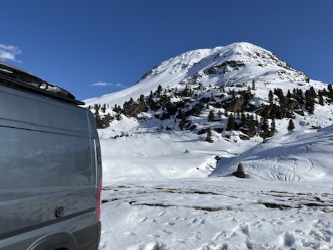 To still stay active after all the sauna, we decided to do „a little“ hike the next day. The plan was an easy 8-9 km round with not too much elevation and about one kilometre through an unlit dark tunnel. After 200m we saw the first little patch of snow and should have known at that point what we are up to…. but we did not and we just continued. Of course the snow patches grew bigger and bigger and after moving through the 1 km long pitch black tunnel (luckily we had our head lamps with us) we ended up in deeper snow. At this point we should have turned around, but we did not…. So we sank deeper in the snow. Lindas full calves disappeared at times in the snow and we just continued stubborn. At one point we crossed an about 200m long snow field where we sank every step with our full legs in the snow. Naturally the snow fell into our shoes and our feet slowly got wet. We could have still turned around, but we did not…. From here on we more in more in the snow until the path totally vanished and we had to best guess where it continued. We were deep in the snow and our feet were cold and wet. The mood switched from happy and funny to annoyed and luckily we both motivated each other to continue. When we knew that only 2 km were left we made a little break took off our shoes and socks and „dried“ them in the sun although nothing dried at all. The last two kilometres the path was clear but the feet were ice cold and hurt. We were happy when we were back at Rosi and could take off shoes and socks to dry ourself….We dried everything in the drying room of the camp ground and moved the next day as planned to the Kaunertaler glacier, where we were yet again surprised with really good conditions and long and empty slopes. Linda improved crazy on skis in our time on the slopes and had just started to carve which looked amazing and I could not keep up with her anymore. In the first few days of skiing we had bought skis for Linda and Rosi looked so sexy with the winter setup of skis and snowboard on her back. After another amazing day on the slopes, we wanted to drive all the way back through the valley since it was officially not allowed to camp free anywhere in Tirol. Camping in Tirol is not so easy in general. Every camp ground costs you 50€ a night and there are hardly ans spots to camp free. But here at this spot there were quite a few campers at the lift and we spontaneously decided to stay for a night directly at the lift and so we did. It was a beautiful winter wonderland we were camping in and the next day we were happy about another beautiful day of skiing…All in all this month was together with the visit on the Galapagos islands the most expensive month of our trip and it left us with a deep hole in our budget and a lot of austrian Apres-ski songs stuck in our heads (The worst one about a piece of furniture…. if you know you know).