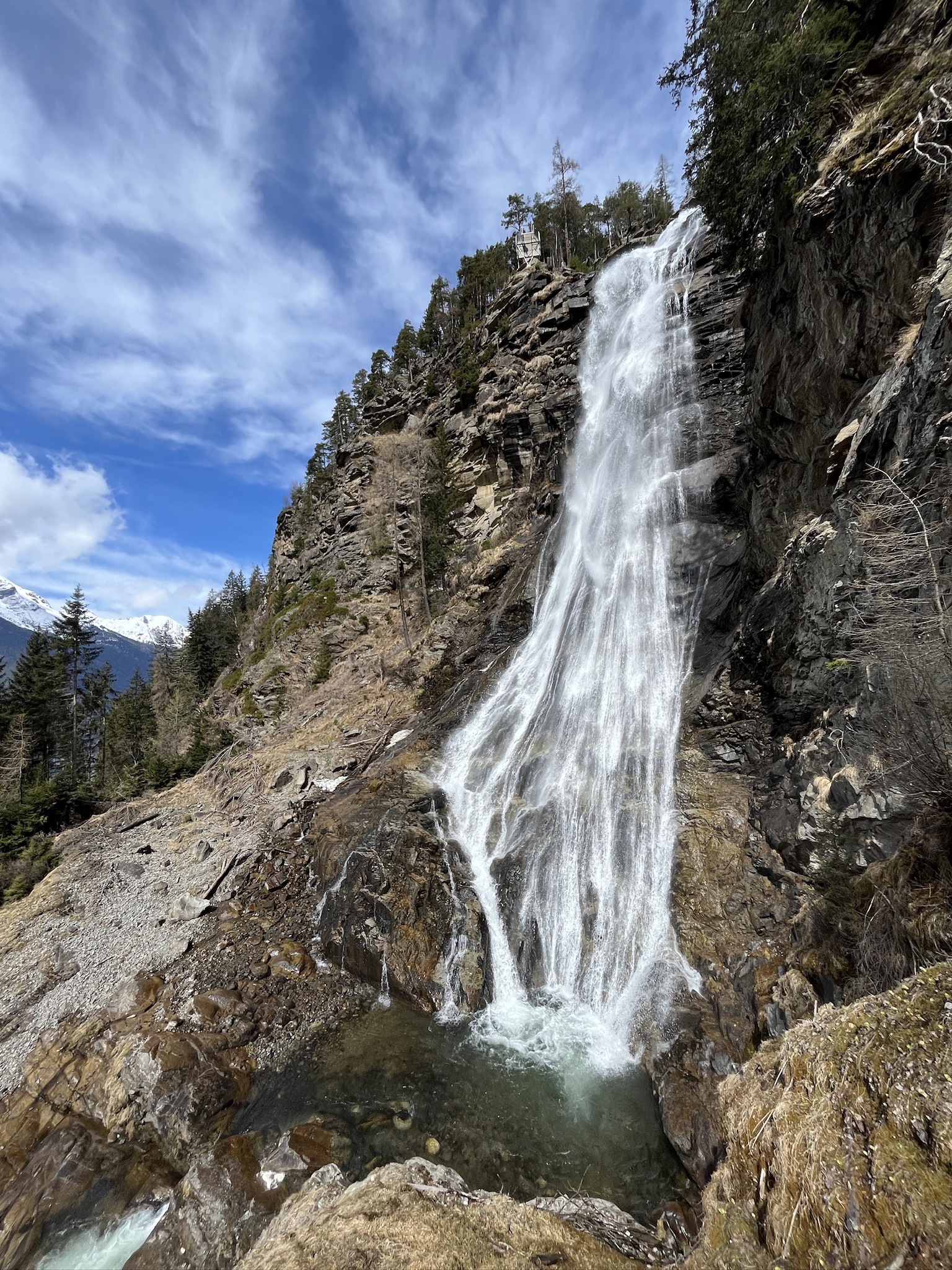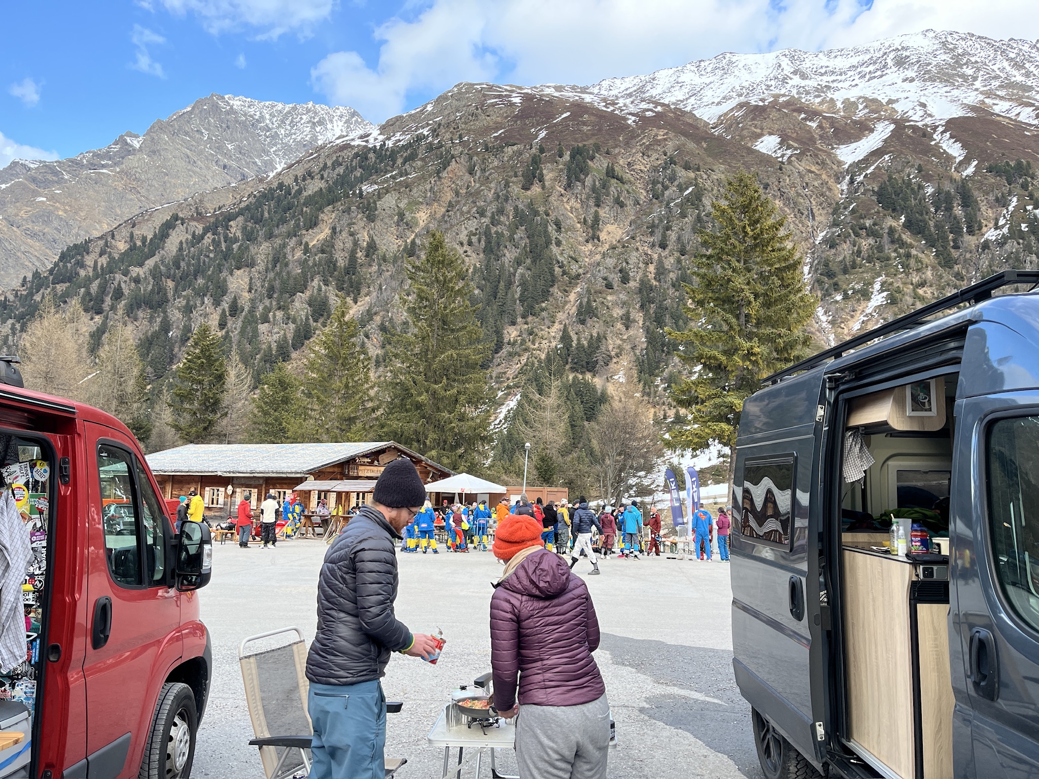 Since the snow conditions stayed good, we continued skiing and moved to the Kühtai. A few years ago we were still allowed to camp right at the bottom of the slope, which is sadly not possible anymore. Nevertheless we had two more days of pretty good conditions and almost empty slopes. We couldn’t beliefe ourself, it was just soo good… and when we looked at the snow forecast it should become even better. To rest our muscles we first spent a few nights in the Ötztal and hiked the beautiful Stuibenfall waterfall.