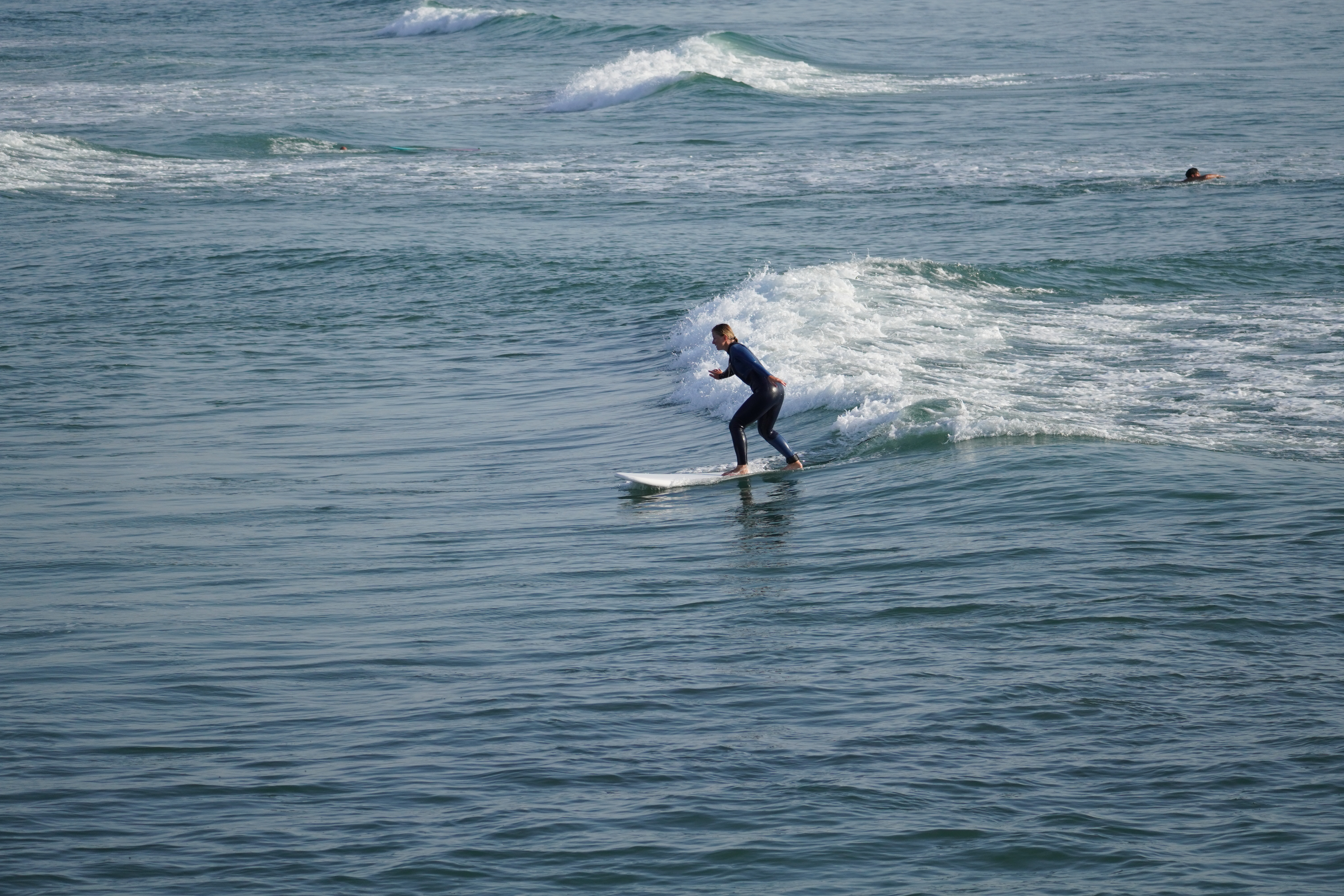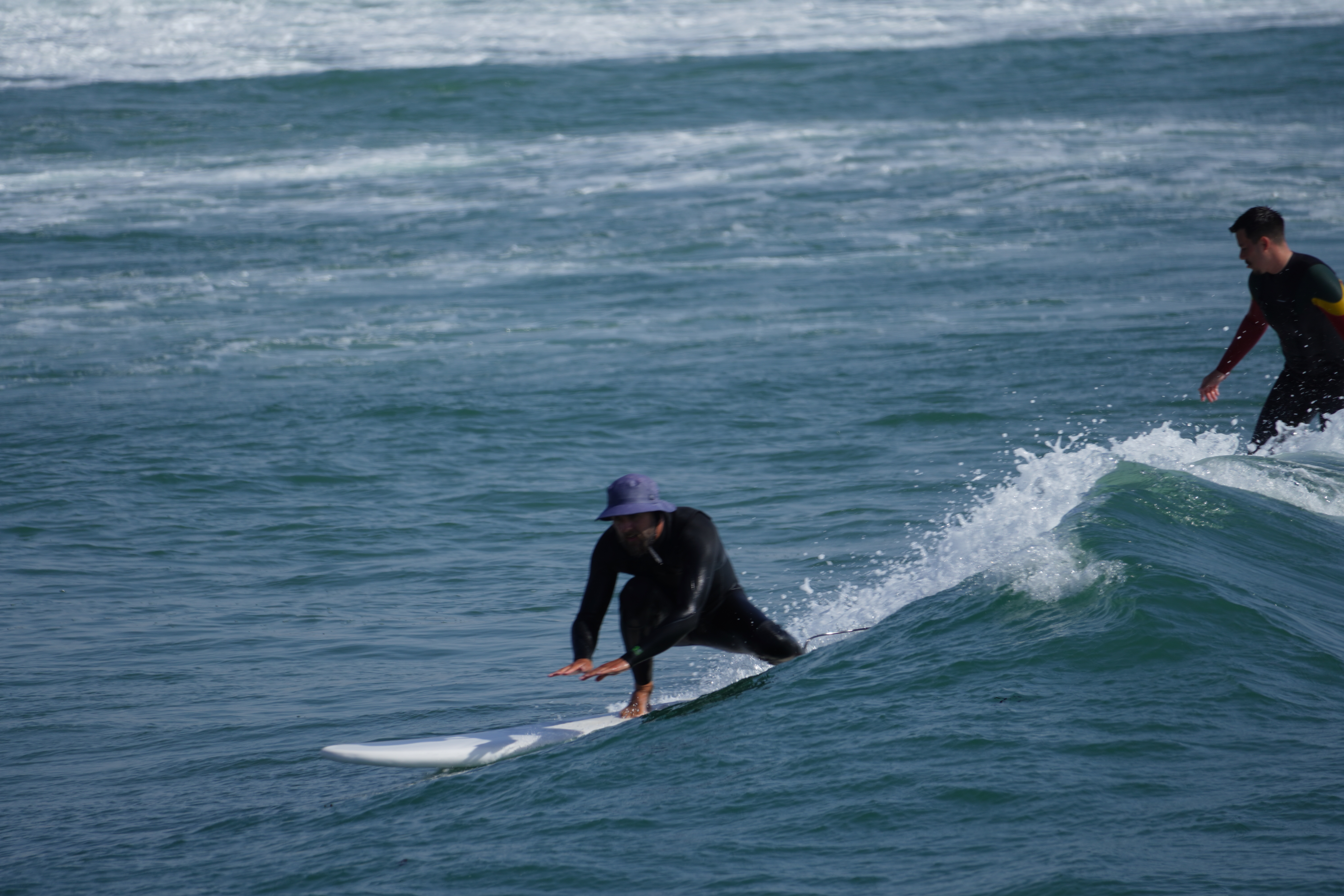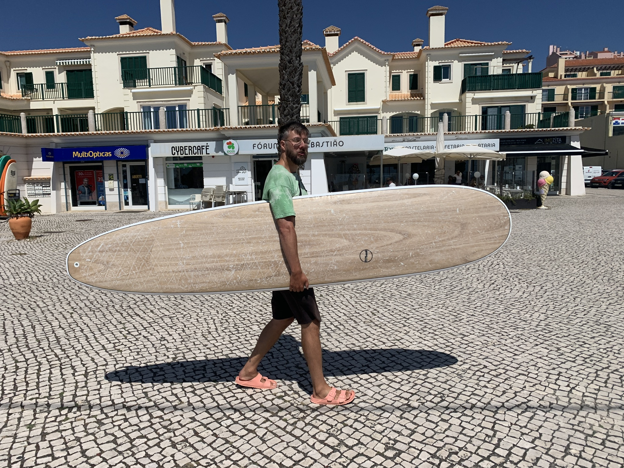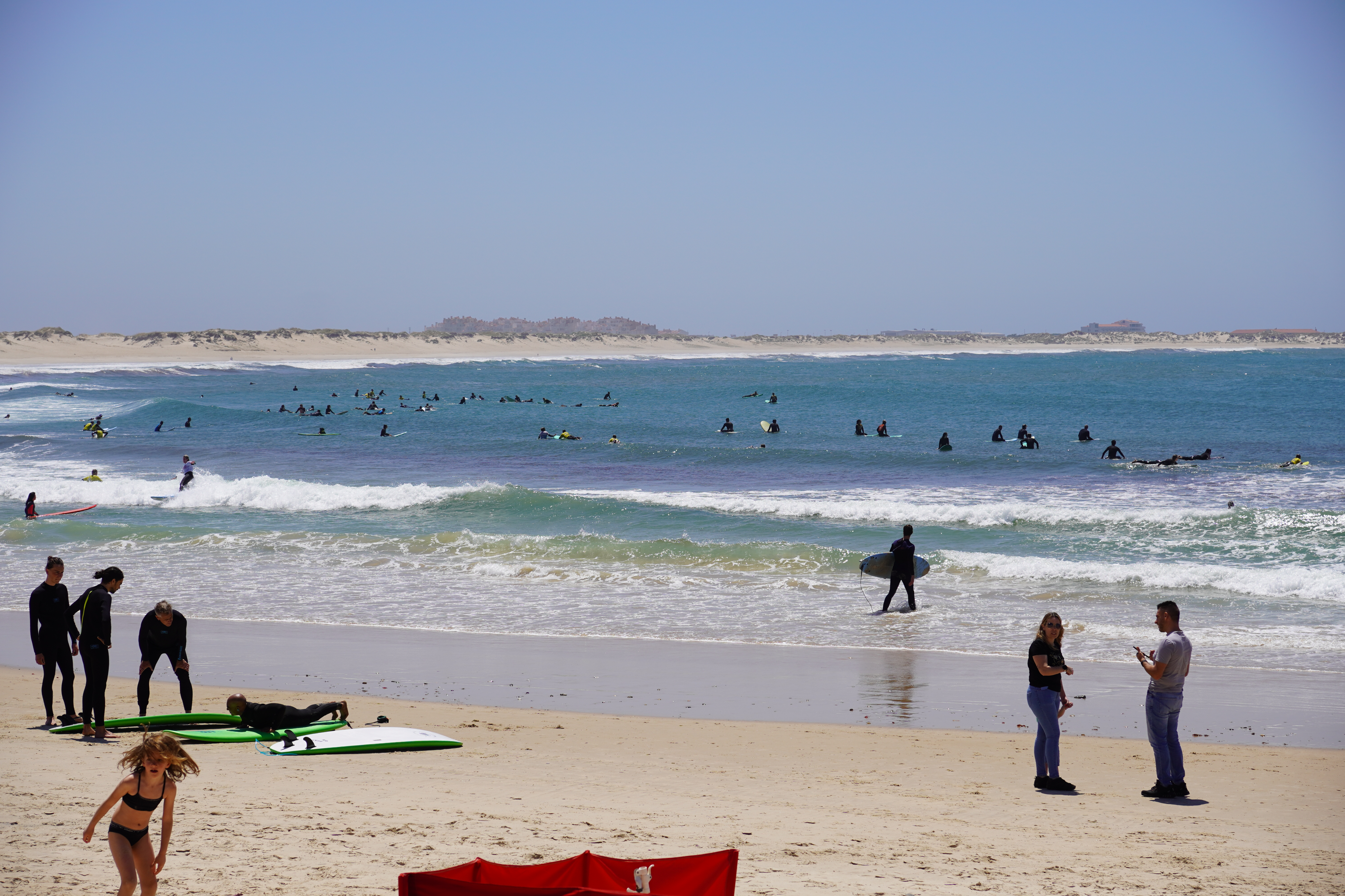 Since Linda had never been in Lisbon, we made our way back south again and stayed in a little village north of Lisbon form where we took an uber into the city. AI had helped us to design a little walking tour and we started up high at the Miradouro de Santa Luzia with a nice view over the city, before we started to walk down. After passing through the rua Augusta to the Praça do Comercio, where we tried the Ginjinha, a typical cherry liqueur from a chocolate cup, we made a little break at the Time Out Market before we took a rental bike to the LxFactory. This is a really nice alternative industrial area that reminded us of Berlin. We strolled around and had a nice dinner there. I had another flashback, because many years ago I have been on the same area for a conference. Later that day we drove back up north to the beautiful parking next to a beach south of Ericeira, where we had stayed the nights before as well. The next days we strolled through Ericeira and the city center really still has the old fisherman’s village vibe, although there are tourists everywhere. A little bit outside of town there is a huge Boardriders store and a big skatepark in front. Linda used this opportunity to take out our surf skate and skate a few turns. Sadly the waves never that good that we could jump in the water, but we still wanted to surf a lot so we „accidentally“ bought another surfboard. In the city center of Ericeira we found a little surf shop with very fair offers. Since we expected the waves to be small at the north coast of spain in the upcoming weeks we bought a longboard. It was used but still as good as new and built very sturdy since we have to load and unload it on the roof of Rosi and did not want to break it the last few weeks. As there were no waves in Ericeira we drove back up north to Peniche and Baleal to go surfing with our new board the first time. … and this is what we did in Baleal. The conditions were perfect, which motivated us…. but not only us. I am not joking that there were around 100 people in the water. It was packed, but we still joined in. As we were in the water the waves got bigger and bigger and we both struggled to get waves in-between all the others surfers. Also I found out in this session that we bought a board that is completely flat. That is very beneficial once you are in a waves and surf along the face of it, because it gives you a lot of speed, but it makes catching a wave incredibly harder, because if you are just a tiny bit too slow while standing up you dive in the water with the nose of your board…and this happened to bith of us ….a lot! Nevertheless it was fun to be in the water together and we celebrated the end of the session with an ice cold super bock beer in the Parking lot. On our way farther north we stopped again in Figueira da Foz and both surfed again in the really good waves (but this time with less people) of the beach break that we already knew from the surf camp.