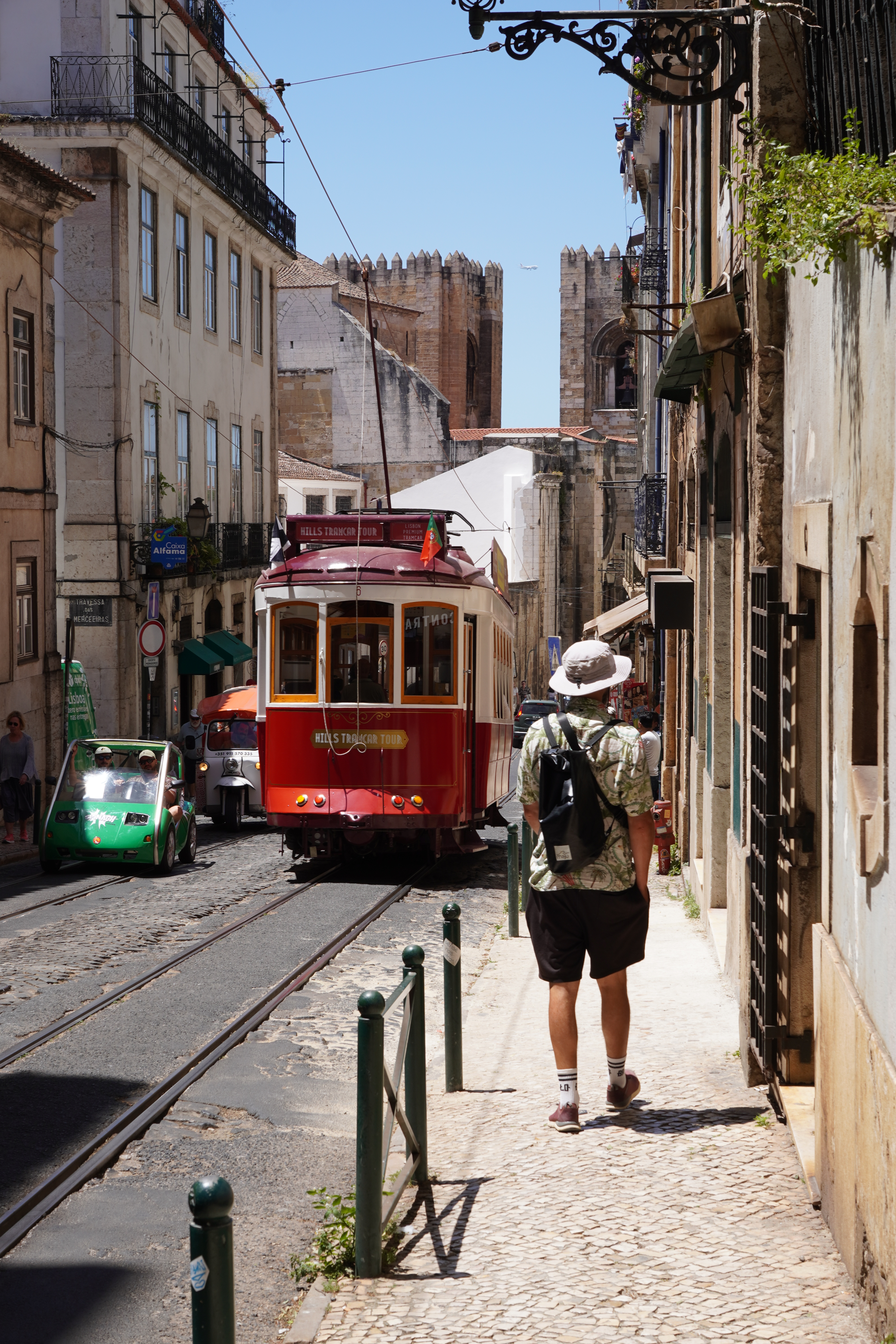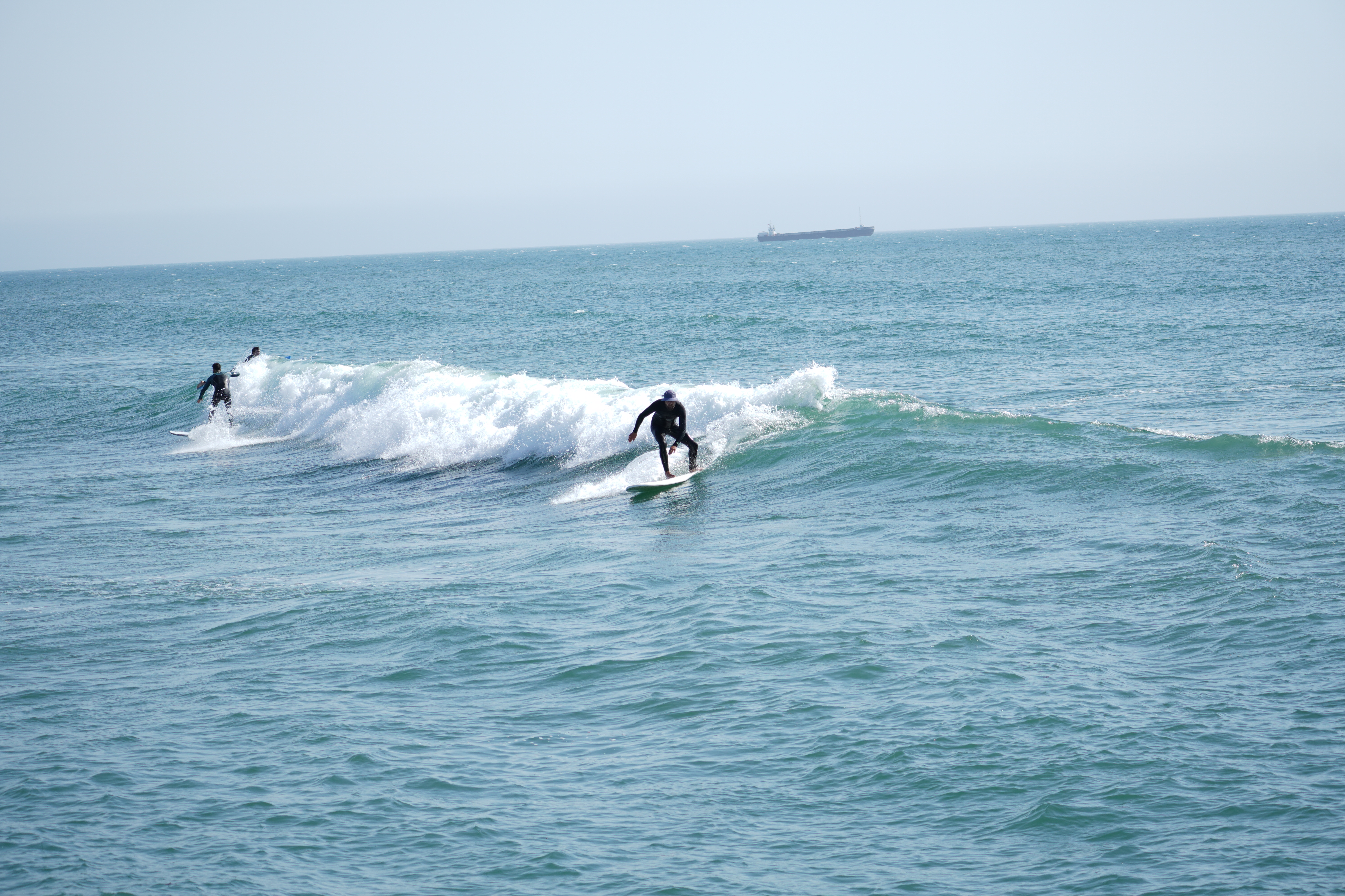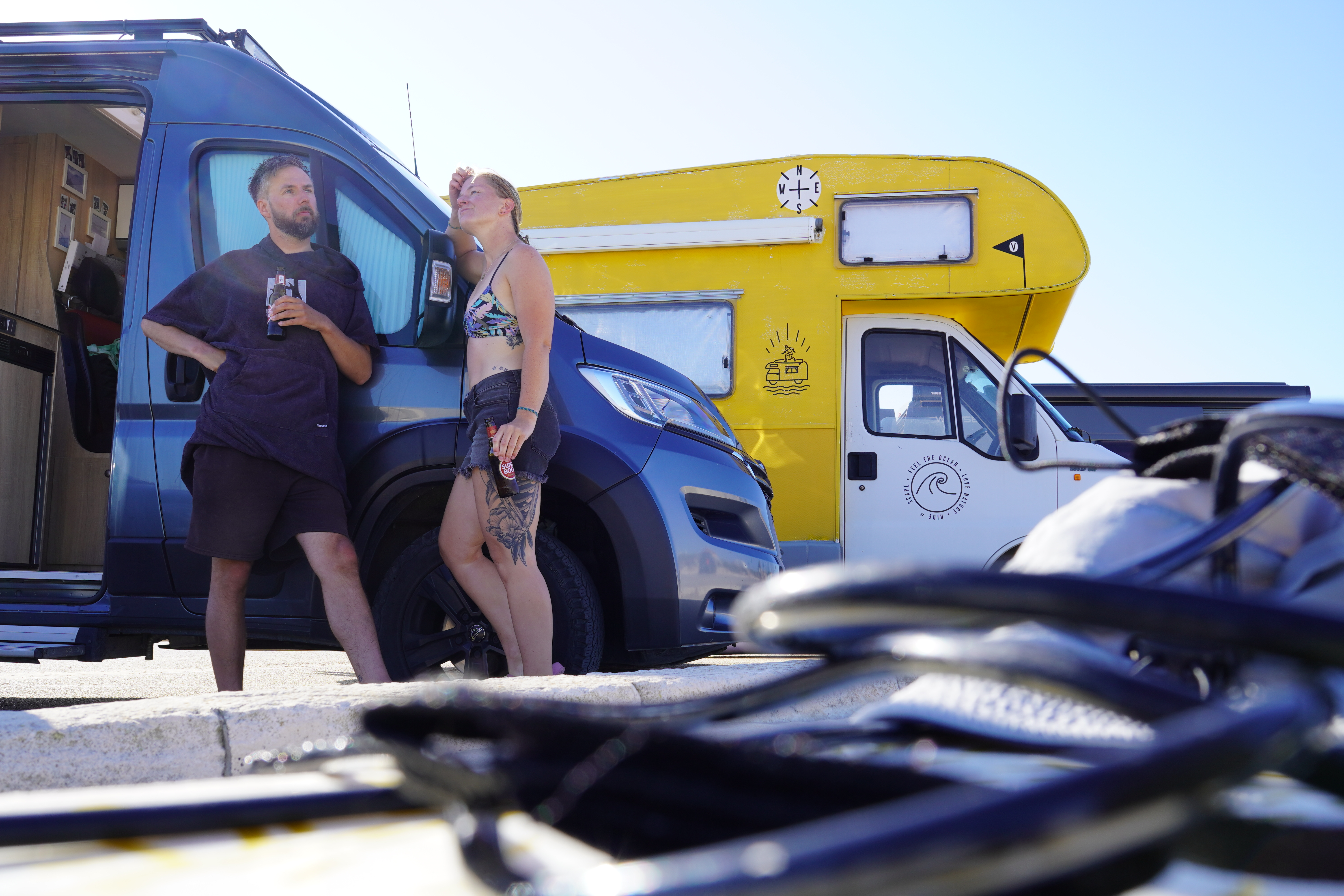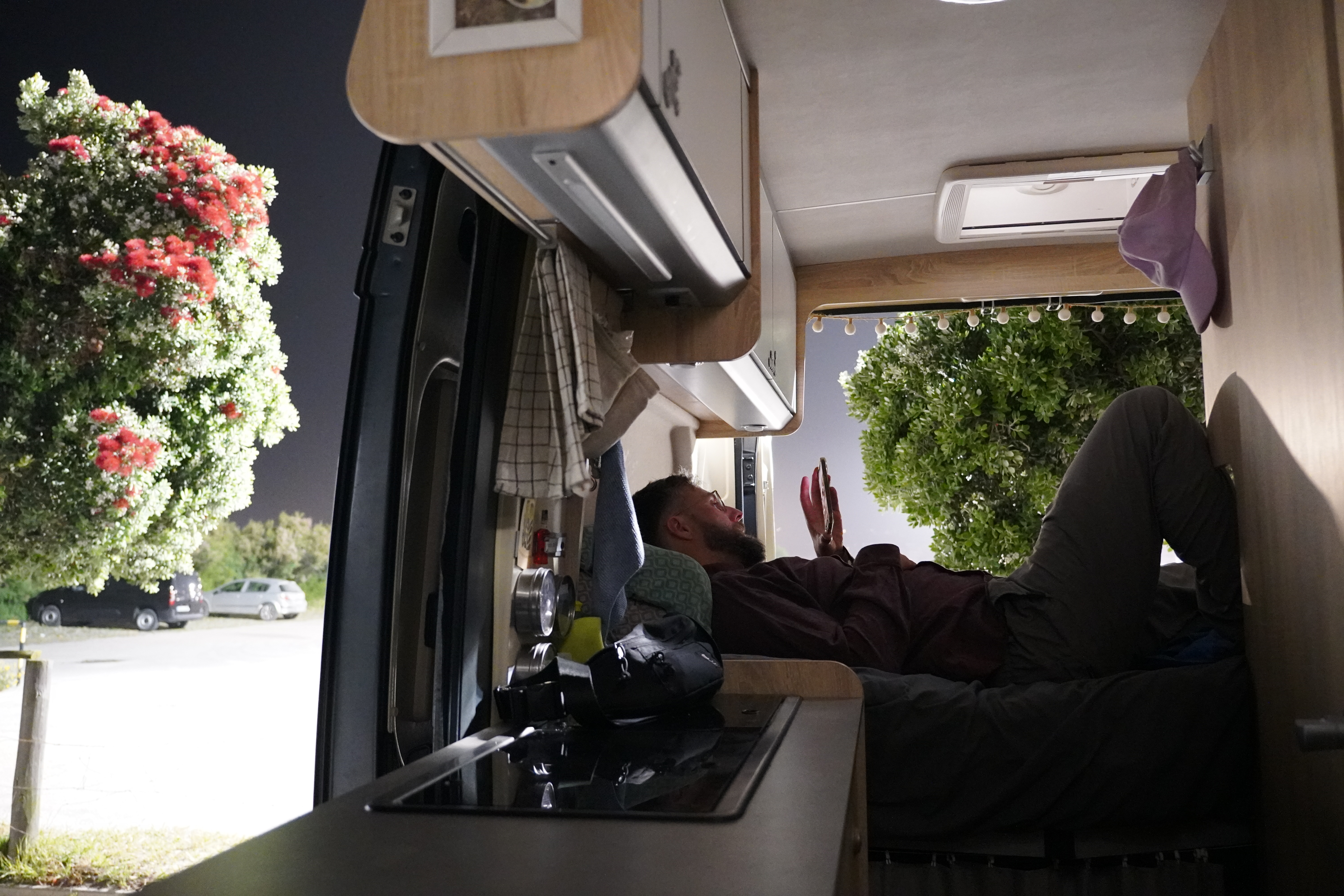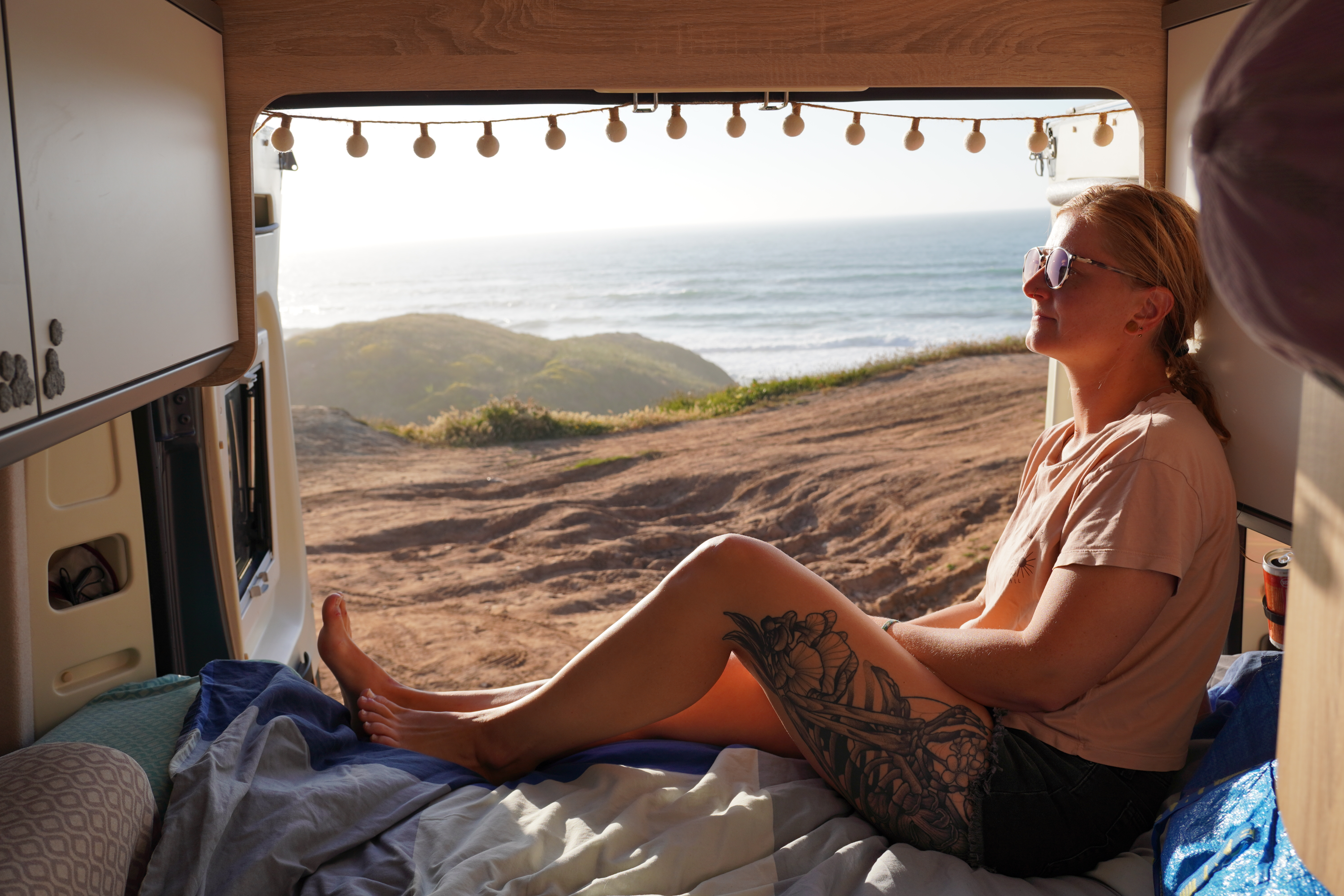 Since Linda had never been in Lisbon, we made our way back south again and stayed in a little village north of Lisbon form where we took an uber into the city. AI had helped us to design a little walking tour and we started up high at the Miradouro de Santa Luzia with a nice view over the city, before we started to walk down. After passing through the rua Augusta to the Praça do Comercio, where we tried the Ginjinha, a typical cherry liqueur from a chocolate cup, we made a little break at the Time Out Market before we took a rental bike to the LxFactory. This is a really nice alternative industrial area that reminded us of Berlin. We strolled around and had a nice dinner there. I had another flashback, because many years ago I have been on the same area for a conference. Later that day we drove back up north to the beautiful parking next to a beach south of Ericeira, where we had stayed the nights before as well. The next days we strolled through Ericeira and the city center really still has the old fisherman’s village vibe, although there are tourists everywhere. A little bit outside of town there is a huge Boardriders store and a big skatepark in front. Linda used this opportunity to take out our surf skate and skate a few turns. Sadly the waves never that good that we could jump in the water, but we still wanted to surf a lot so we „accidentally“ bought another surfboard. In the city center of Ericeira we found a little surf shop with very fair offers. Since we expected the waves to be small at the north coast of spain in the upcoming weeks we bought a longboard. It was used but still as good as new and built very sturdy since we have to load and unload it on the roof of Rosi and did not want to break it the last few weeks. As there were no waves in Ericeira we drove back up north to Peniche and Baleal to go surfing with our new board the first time. … and this is what we did in Baleal. The conditions were perfect, which motivated us…. but not only us. I am not joking that there were around 100 people in the water. It was packed, but we still joined in. As we were in the water the waves got bigger and bigger and we both struggled to get waves in-between all the others surfers. Also I found out in this session that we bought a board that is completely flat. That is very beneficial once you are in a waves and surf along the face of it, because it gives you a lot of speed, but it makes catching a wave incredibly harder, because if you are just a tiny bit too slow while standing up you dive in the water with the nose of your board…and this happened to bith of us ….a lot! Nevertheless it was fun to be in the water together and we celebrated the end of the session with an ice cold super bock beer in the Parking lot. On our way farther north we stopped again in Figueira da Foz and both surfed again in the really good waves (but this time with less people) of the beach break that we already knew from the surf camp.
