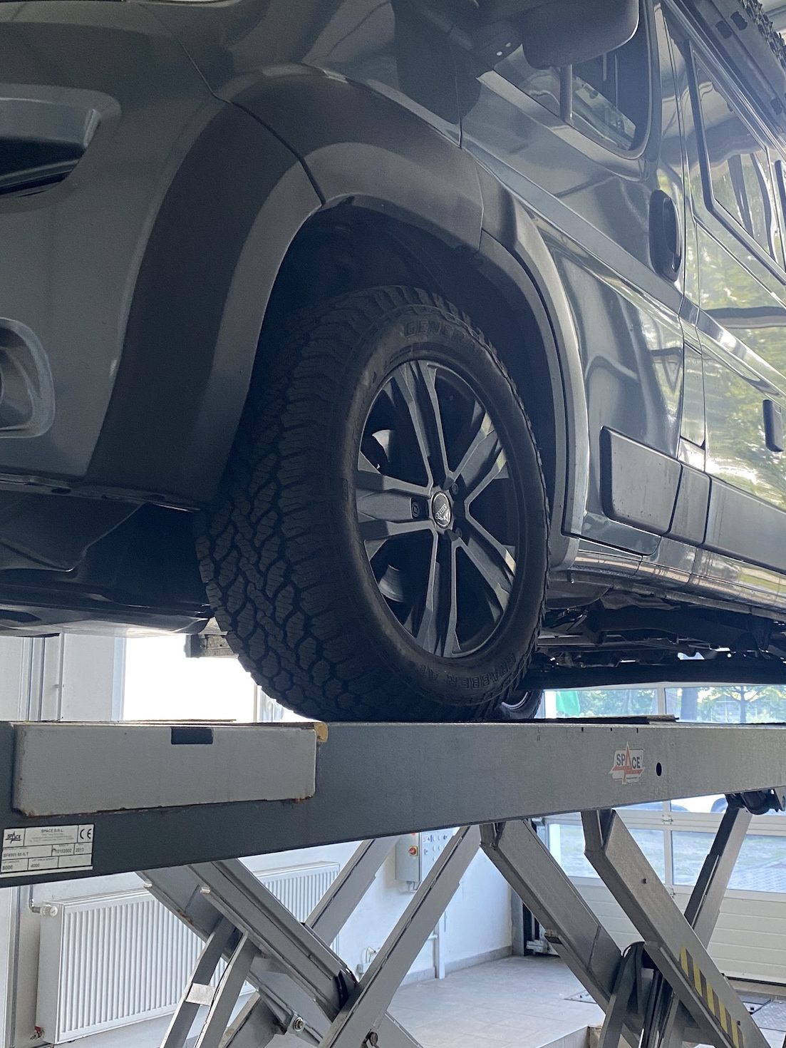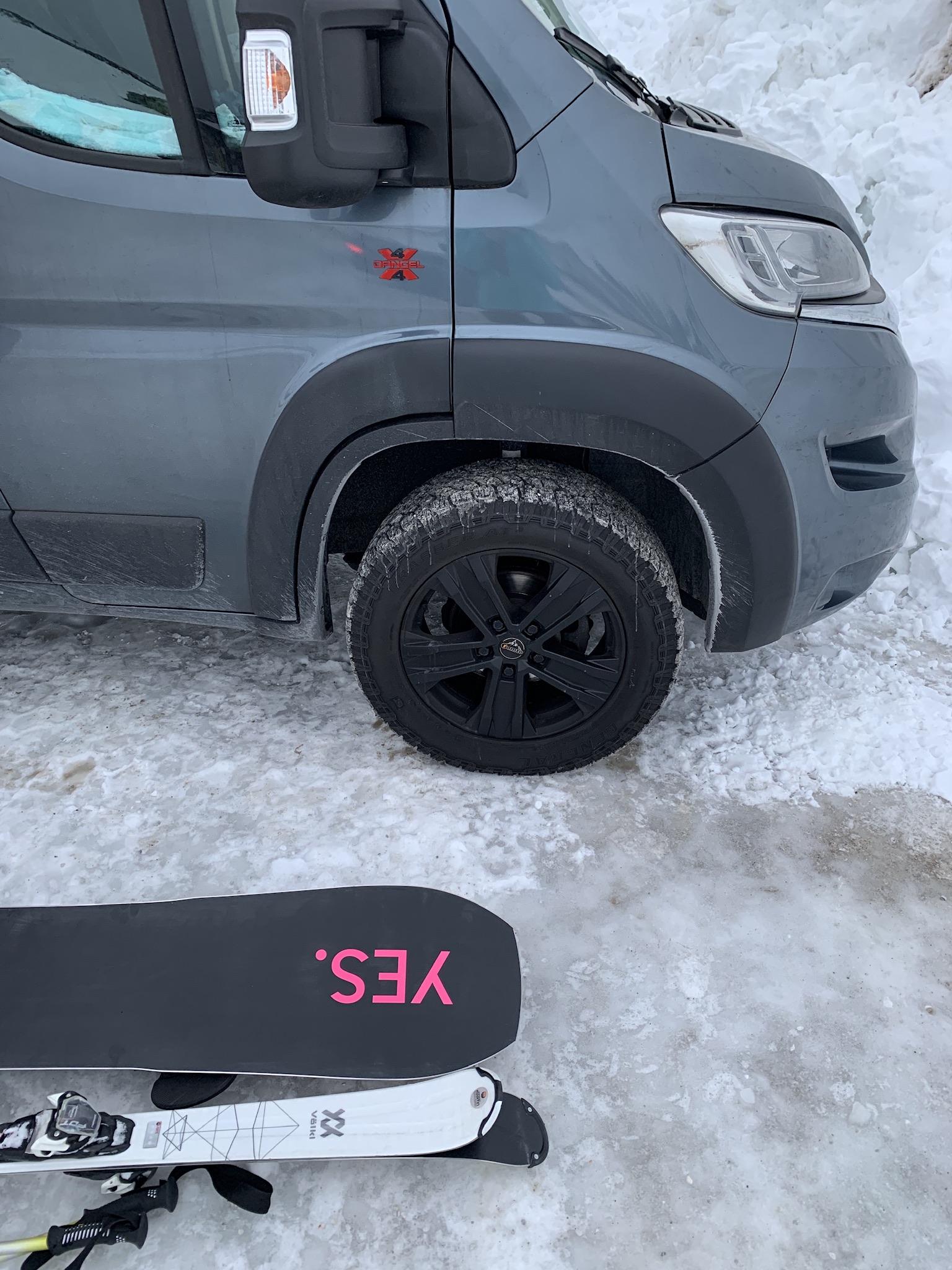 We changed the summer tires to all year offroad tires, in this case the AT3 Grabbers to be prepared for rougher and more slippery terrain. At the same time the wheels were changed from 16 to 18 inch and the suspension was lifted to give a little more ground clearance. The bigger wheels combined with lower tire pressure improve the driving experience drastically while increasing the fuel consumption only a little. That was definitely a huge improvement. All this was done at Ramto and they did a great job