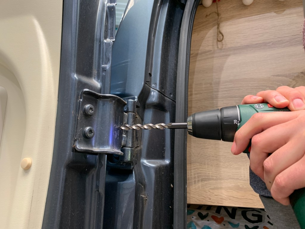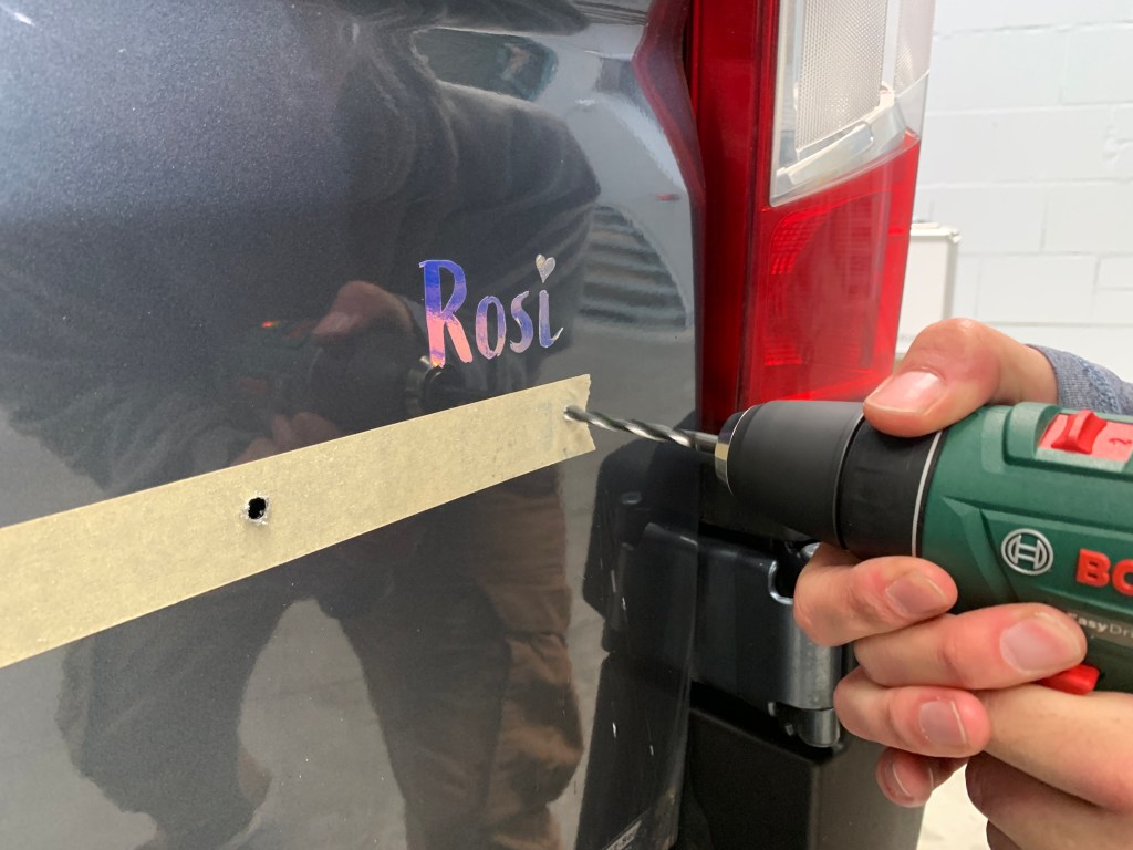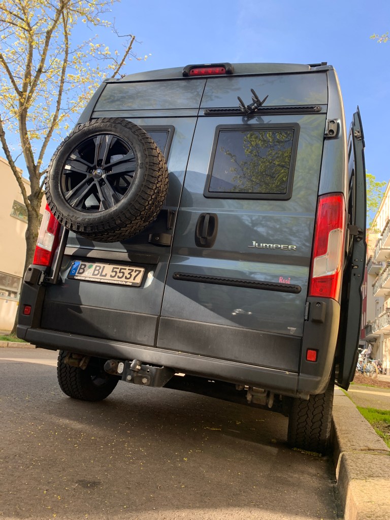One disadvantage (which I was not aware of (or made aware of) when I bought Rosi) of that all wheel drive was the fact that the position for the spare wheel under the van is taken by the differential leaves the force to the back axis. So I had to built a construction that carries the spare wheel. There are only a few applier for this spare wheel mount for a Citroën Jumper and they are all very expensive, so I reattached a lot until I found the British company Wheeliams. I still had to mount and coat it myself, but this worked all out. I just took some time, because we wanted to be able to carry two bicycles while carrying the spare wheel, and there are very very very few (not super expensive) options for that.