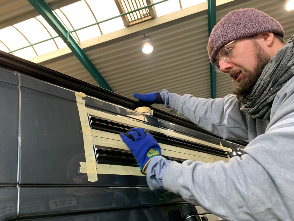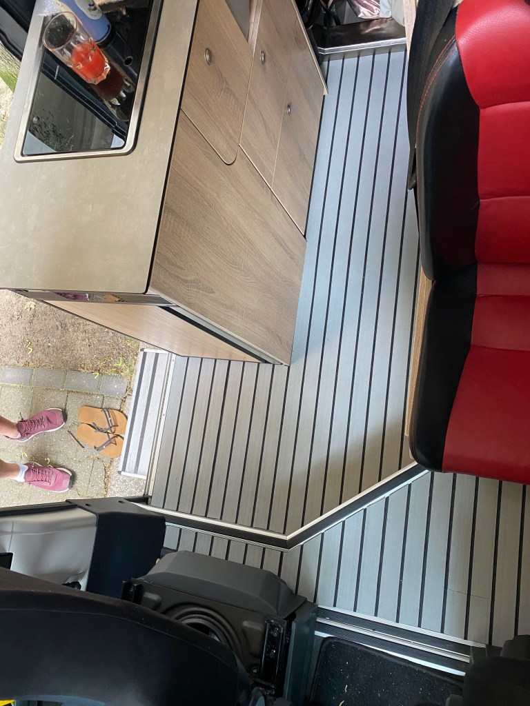 We did not like the floor of rose at all. It got dirty immediately and was hard to clean, and also it was always cold. When a friend at our Wakeboard lake near Berlin showed us his amazing new foam floor that was made for boats, we didn’t hesitate, and just built it in Rosi. It looks amazing and it feels amazing. It will get through the test right now.
