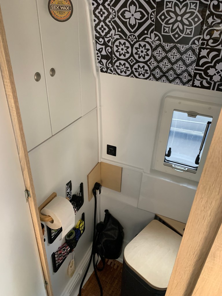The „bathroom“ in our small camper was very tight from the beginning and we never really used the sink there. So we removed the sink and installed a new shower. The bathroom is way bigger now, and we have a really cool shower that we use mostly out of the window to shower outside.