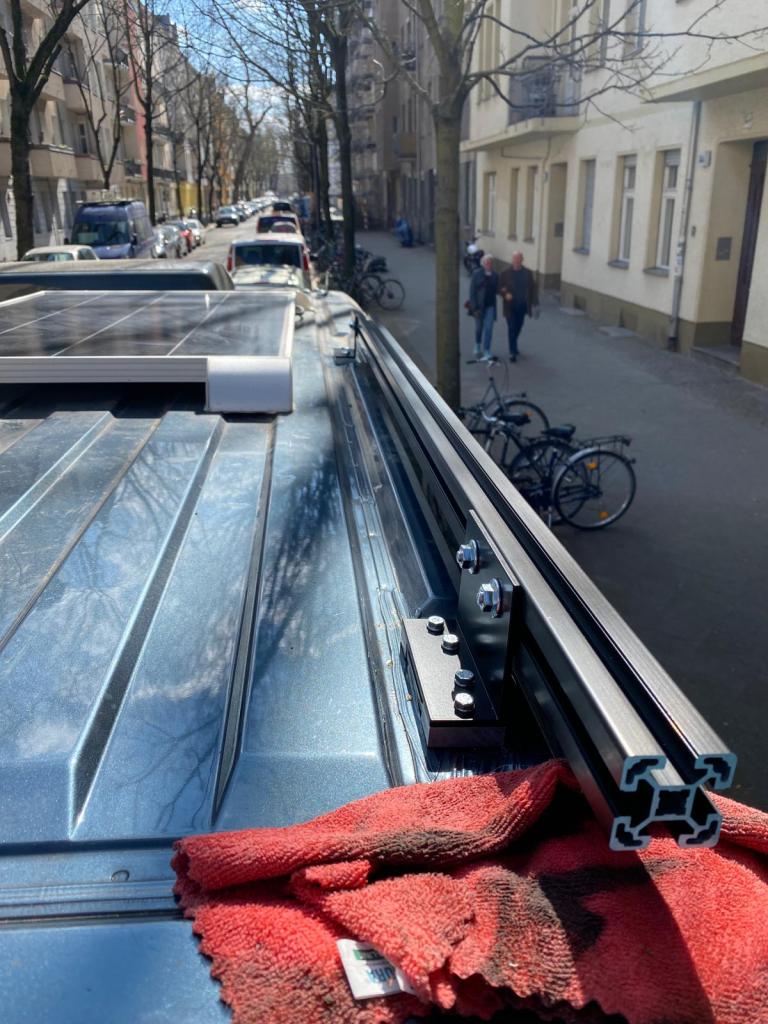 From the beginning it was clear to me that I need to carry a surfboard on the roof, so I needed a roofrack. I got a self built kit and installed it myself. A mistake from the van retailer where I bought Rosi led to the fact that the solar panel was installed in the direction of the car and not rectangular to it. This mistake turned out to be pretty good, because now we can carry several surfboards and a fuel canister and the solar panel is still completely free.